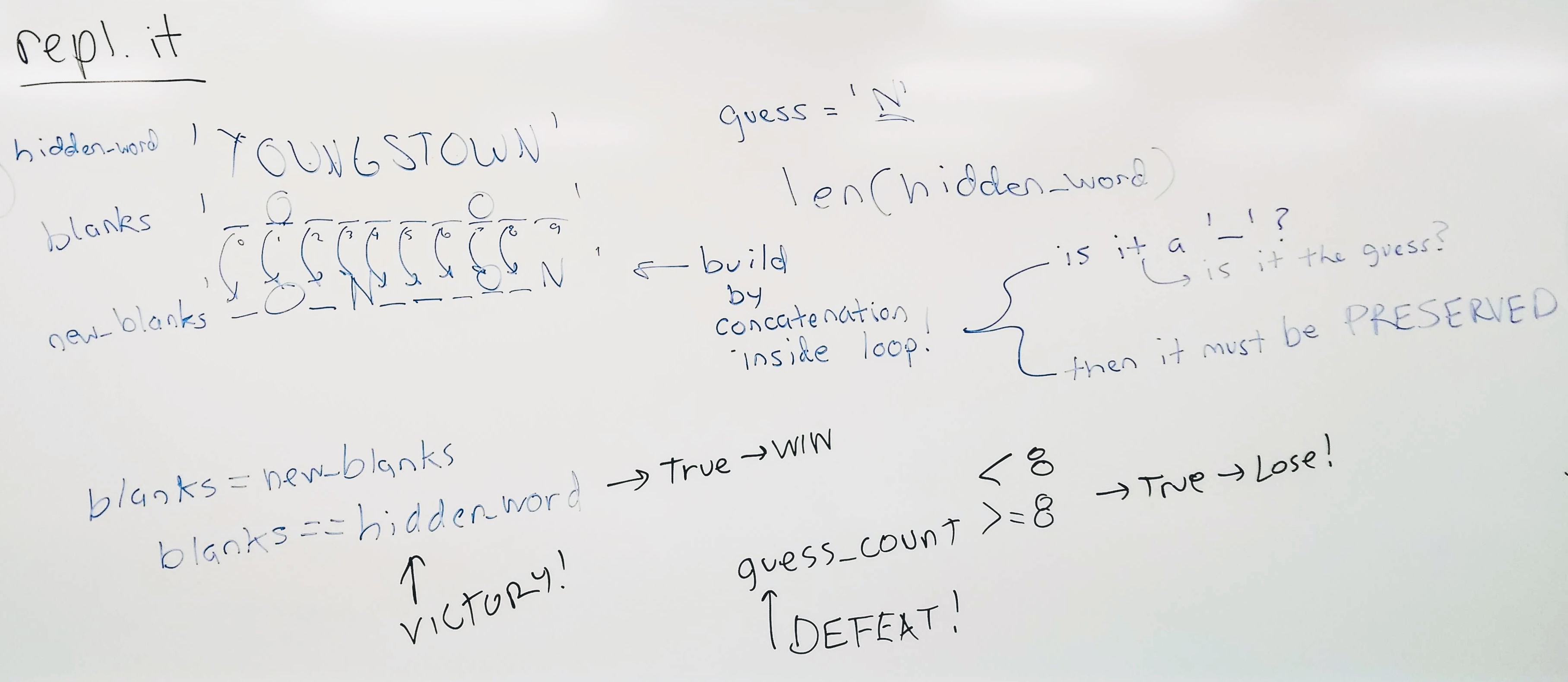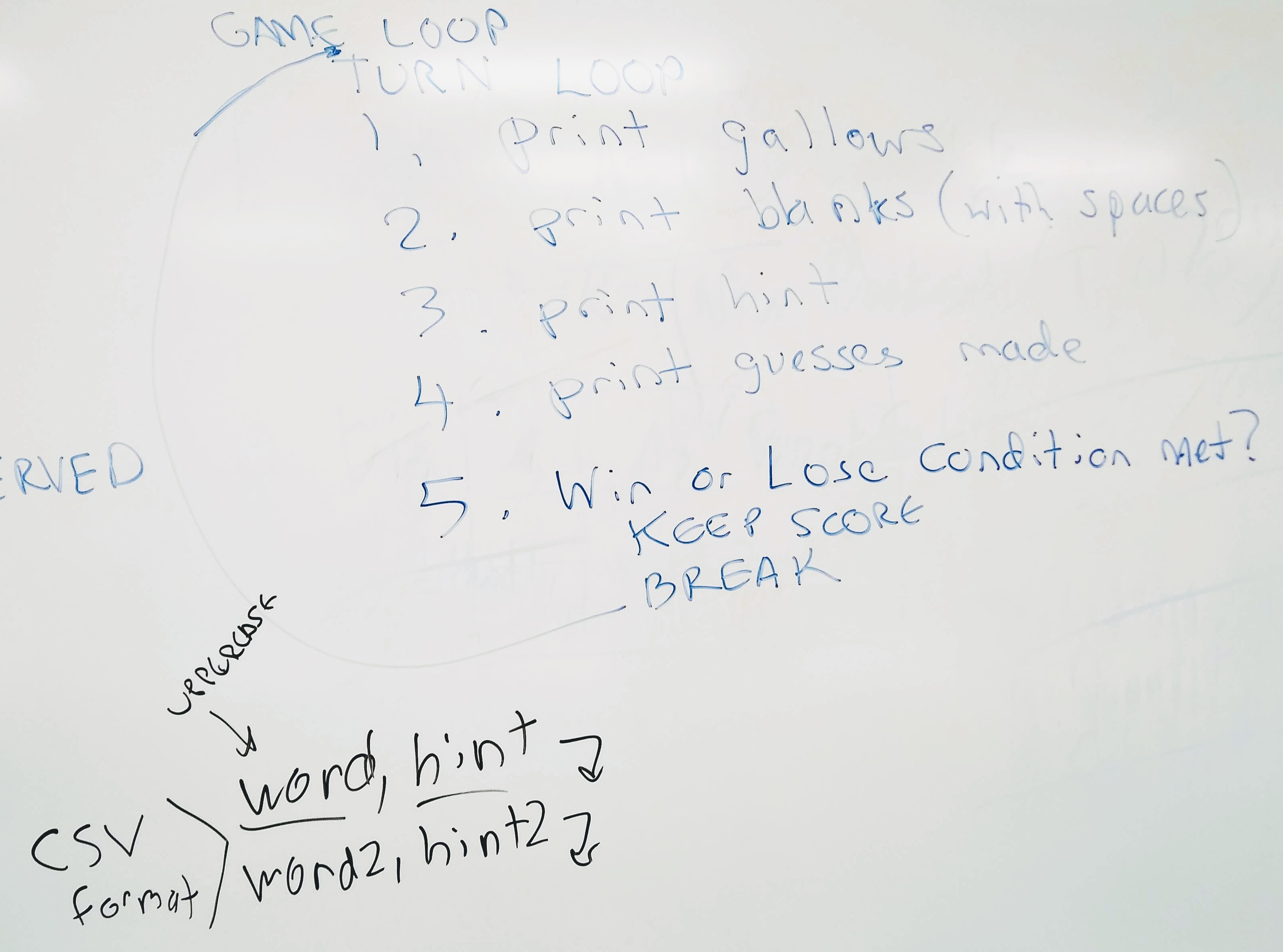 - Use the provided starter function to display the gallows (please do not alter it or handcraft your own ASCII art, it's a huge waste of time).